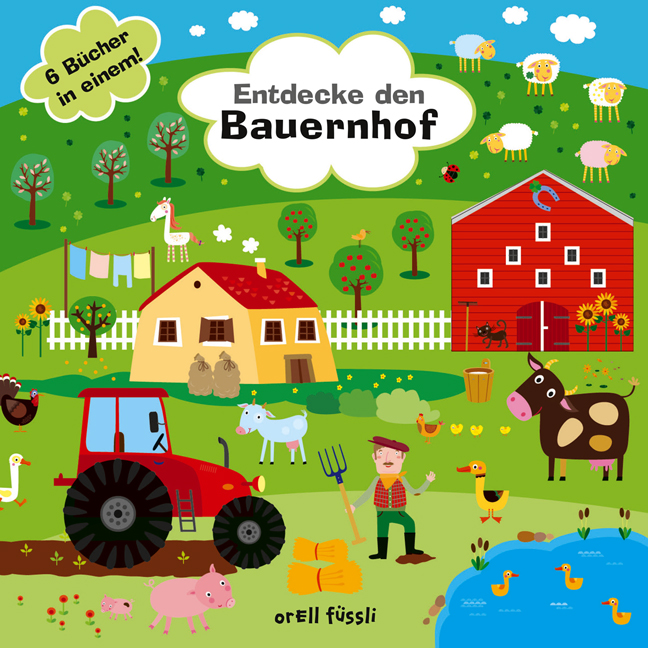 Mit diesem Spiel-Pappbuch können kleine Kinder sich auf einem Bauernhof tummeln. Klappt man die Bücher auf, findet man eine großflächige, bunte Darstellung, gestaltet wie ein Spielfeld. Darin sind jeweils sechs kleine Pappbüchlein angebracht.
