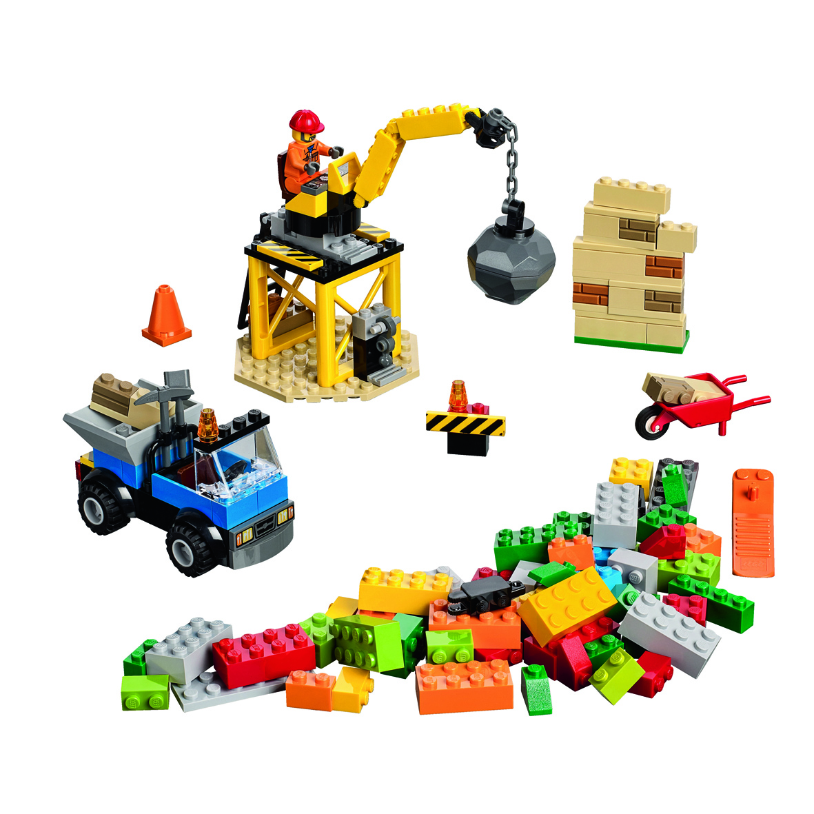 - Mit einfach zu bauendem Baustellenlaster, Kran mit Abrissbirne und Wandelement