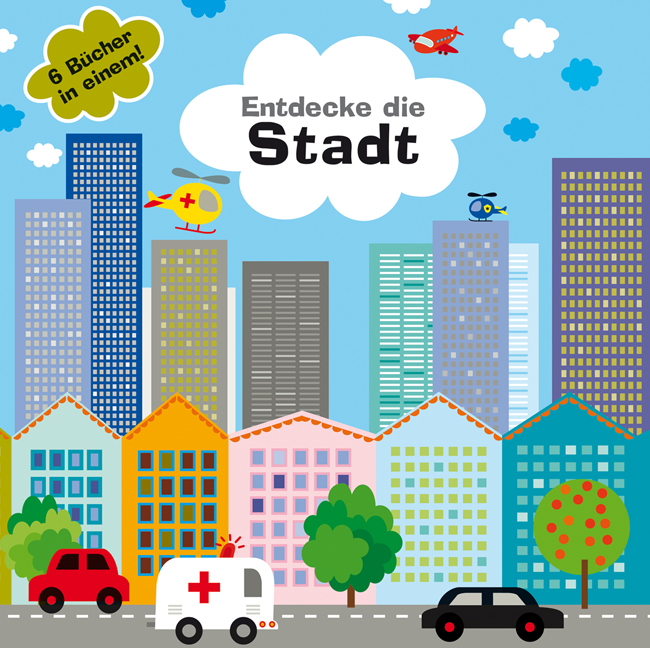 Mit diesem Buch-Spielzeug können die Kinder eine Stadt erkunden. Wird das Buch aufgeklappt, findet man die großflächige Darstellung einer Stadt, gestaltet wie ein Spielfeld. In sechs weiteren, auf dem Feld angebrachten Pappbüchlein werden wichtige Gebäude der Stadt dargestellt. Die Kinder lernen, wer bei der Feuerwehr arbeitet und was die Polizei macht. Sie können das Schulhaus oder Museum anschauen und sich im Spital umsehen. Und im Supermarkt sehen sie, was es alles zu kaufen gibt.