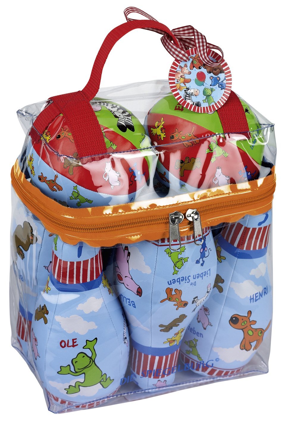 Das Kegelset von Die Lieben Sieben besteht aus sechs Kegeln und zwei Bällen. Die Motive sind aus den Lieben Sieben gewählt und die Kinder erkennen sie sicherlich wieder. Schön bunt und fröhlich sind sowohl die Figuren, als auch die Bälle. Das Material ist weich und angenehm und man kann sich damit nicht verletzten, auch wenn die Bälle mal ihr Ziel verfehlen!