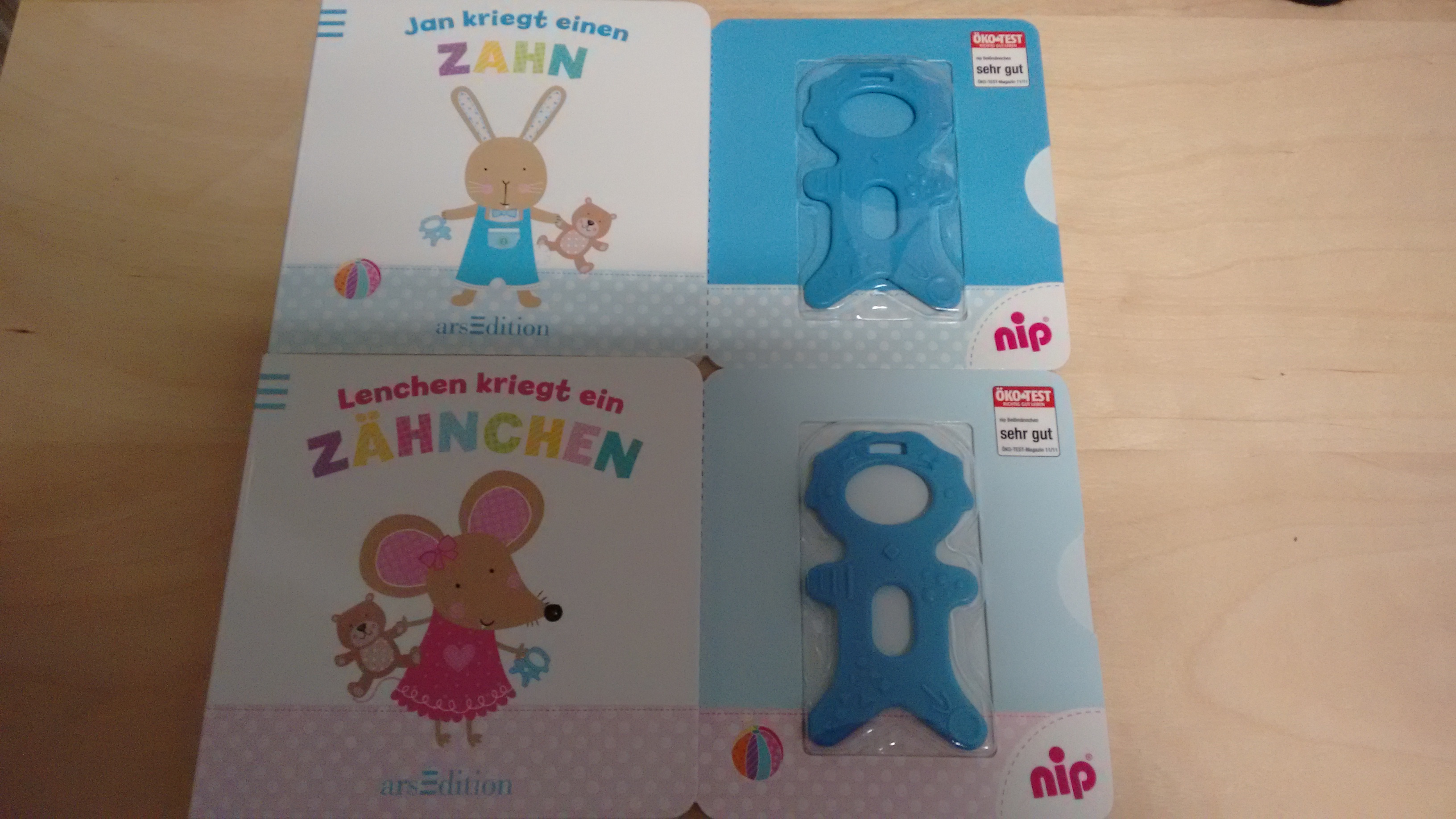 Diese beiden süßen kleinen Büchlein – eigentlich mehr für Mamas und Papas, als für 6 Monate alte Babys, sind wirklich sehr lieb und sehr gut gelungen. Nicht nur die beiden Geschichten sind herzig – es gibt sogar einen Mehrwert 🙂 Jedes der beiden Bücher hat einen Beissring dabei. Lt. Ökotest mit sehr gut ausgezeichnet – was bei Mamas ein sehr wichtiges Kriterium ist, um in Babys Mund zu gelangen. Ich finde diese Sets ein sehr liebes Mitbringsel, wenn die Babys zu zahnen beginnen.