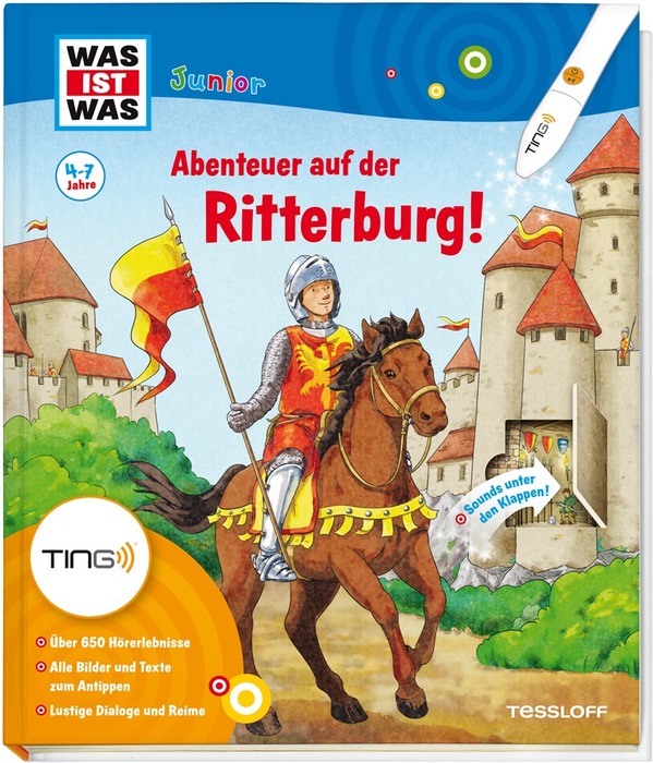 Pferde wiehern, Schwerter klirren und aufgeregtes Stimmengewirr ist zu hören auf der Ritterburg findet heute ein Turnier statt! Mit dem TING-Stift tauchen kleine Mittelalterfans direkt ins Geschehen ein. Sie hören den lauten Schlag des Steins, der beim Angriff mit dem Katapult geschleudert wird, sind beim Festmahl live dabei und erfahren alles über das Leben einer Ritterfamilie.