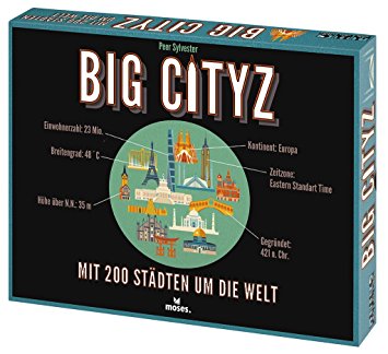 Mit 200 Städten um die Welt! Wer kennt Chihuahua? Nicht den Hund. Die Stadt! Schon mal gehört? Fein. Aber wo liegt das eigentlich? Und wie sieht es mit Honolulu aus? Hat die Stadt mehr als 1 Mio. Einwohner? Hat sie einen internationalen Flughafen? Das sind die Fragen, die es in Big Cityz zu beantworten gilt. Aber keine Sorge, die Spieler müssen nicht alles ganz genau wissen. Auch mit logischem Denken und einem guten Bauchgefühl hat man gute Chancen, das Spiel zu gewinnen. Denn gut geschätzt ist halb gewonnen, bei diesem unterhaltsamen Geographie-Spiel.