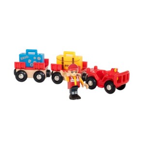 Wenn dieser Gepäckwagen über das Flughafengelände fährt, um die Koffer zu den Flugzeugen zu bringen, ist er einfach nicht zu übersehen. Der BRIO Flughafen-Gepäckwagen enthält einen Arbeiter, einen Geländewagen und zwei Anhänger, auf die jeweils genau ein Koffer passt. Eine ideale Ergänzung für jeden BRIO Flughafen und die komplette BRIO World.