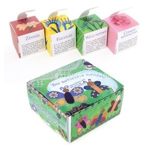 Der Schmetterlingsgarten enthält vier kleine Boxen mit folgenden Samen: Cosmos, Zinnie, Facelia und Wildfenchel.