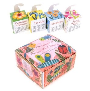 Der Garten der Nutzinsekten enthält vier kleine Boxen mit folgenden Samen: Coreopsis (Mädchenauge), Duftwicke, Facelia und Ringelblume.