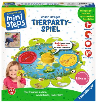 Quak, quak! Floki Frosch lädt zur Tierparty am Teich ein. Wer hilft ihm, seine 12 Tierfreunde zu finden und sie mit Hüpfen, Flattern und Krabbeln zum Teich zu bringen? Frosch Floki führt höchstpersönlich durchs Spiel. Er spricht aus dem elektronischen Modul zu den Kindern und sorgt mit vielen Tierstimmen, Geräuschen und einem gesungenen Froschlied für Stimmung. So heißt es zum Beispiel „Sucht meinen Freund, die Katze und lauft auf allen Vieren!“ Wer die Katze findet, darf sie an ihren Platz am Teich puzzeln. Drei ansteigend schwere Spielvarianten mit vielen unterschiedlichen Bewegungsformen garantieren lang anhaltenden Spielspaß. „Unser lustiges Tierparty-Spiel“ aus der Kleinkindserie Ravensburger ministeps fördert auf diese Weise umfassend Motorik, Sprache, Fantasie, Gedächtnis und räumliche Orientierung.