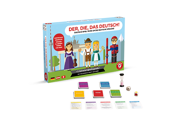 Deutsch: Die einen können es schon, die anderen lernen es erst, dennoch profitieren alle beim gemeinsamen Spielen von „Der, Die, Das Deutsch!“, erschienen bei Piatnik. Fünf unterschiedliche Schwierigkeitsgrade sorgen für Chancengleichheit und Spannung von Anfang bis Ende. Zusätzlich zu den Must-have-Kategorien eines Sprachlernspiels, etwa Wortschatz oder Grammatik, sorgen Aktionskarten und sogenannte Challenge-Aufgaben für die nötige Würze.