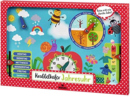 Mit der Krabbelkäfer Jahresuhr geht es spielerisch lernend durch das ganze Jahr. Welche Reihenfolge haben die Wochentage? In welcher Jahreszeit liegt meistens Schnee und in welchem Monat ist es am heißesten? Die Jahresuhr ermöglicht das Einstellen und Ablesen von Jahreszeiten, Monaten, Wochentagen, Uhrzeit, Wetterverhältnissen und der Temperatur. Kindergartenkinder werden so durch das gesamte Kalenderjahr begleitet und lernen wichtige Zusammenhänge, die unseren Alltag strukturieren.