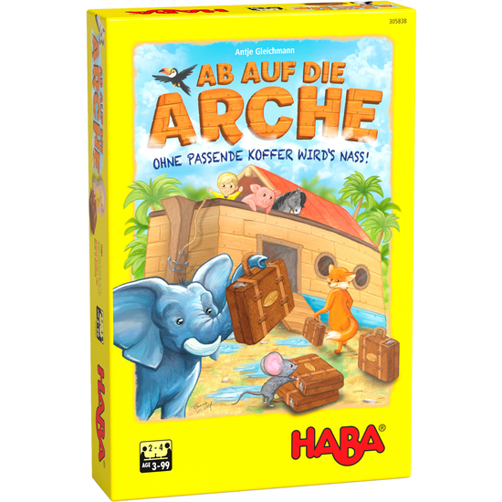 Seit Stunden regnet es! Bei Ab auf die Arche von HABA helfen die Spieler Noah, auch die Tiere samt ihres Gepäcks an Bord der Arche zu bringen. Dazu müssen sie die passenden Koffer-Plättchen zu jedem Vierbeiner suchen und sich merken, wo die nassen Koffer liegen. Die Spieler gewinnen gemeinsam, wenn sich alle Tiere auf dem Schiff befinden. Ab auf die Arche von HABA bereitet Kindern ab 3 Jahren mit seinen einfachen Regeln, den tollen Spielfiguren aus Holz und dem atmosphärischen 3-D-Aufbau ein großes Spielvergnügen. Inhalt: 1 Schiff (bestehend aus Schachtelboden, 4 Trennwänden, 3 Pappteilen), 10 runde Weg-Plättchen, 15 Koffer-Plättchen, 10 Tiere (Elefant, Kamel, Pferd, Kuh, Schaf, Schwein, Fuchs, Katze, Maus, Igel), 1 Spielfigur Noah, 1 Spielanleitung.