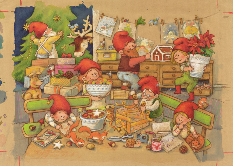 Diese schöne Wichtelwerkstatt zeigt auch entzückend und liebevoll gemalte Tiere wie z.B. ein Rentier mit einem kleinen Vögelchen auf dem Geweih, oder fleißige Eichkätzchen die Nüsse einsammeln und einen kleinen Hund der alles überwacht.