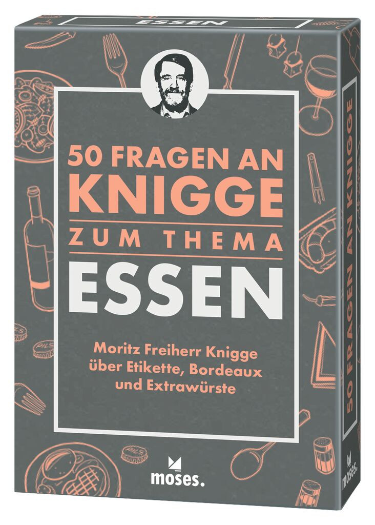 In den Kartensets „50 Fragen an Knigge – Humorvolle Ratschläge für das Wir und Jetzt“ gibt der Knigge-Nachfahre Moritz Freiherr Knigge Antworten auf alle wirklich wichtigen Fragen, die uns heute bewegen. Auf erfrischende Art und Weise gibt er gute Ratschläge, ohne erhobenen Zeigefinger, aber dafür mit einer ordentlichen Prise Witz. Im Knigge des 21. Jahrhunderts werden kontrovers diskutierte Themen humorvoll und dennoch mit gewisser Ernsthaftigkeit auf den Punkt gebracht. Das sorgt in geselligen Runden garantiert für genügend Gesprächsstoff. Getreu der Knigge-Mission für ein besseres Miteinander gibt Moritz Freiherr Knigge hilfreiche Tipps für mehr Menschlichkeit und ein besseres Fingerspitzengefühl. „50 Fragen an Knigge“ ist das perfekte Geschenk für die kleinen und großen Anlässe.