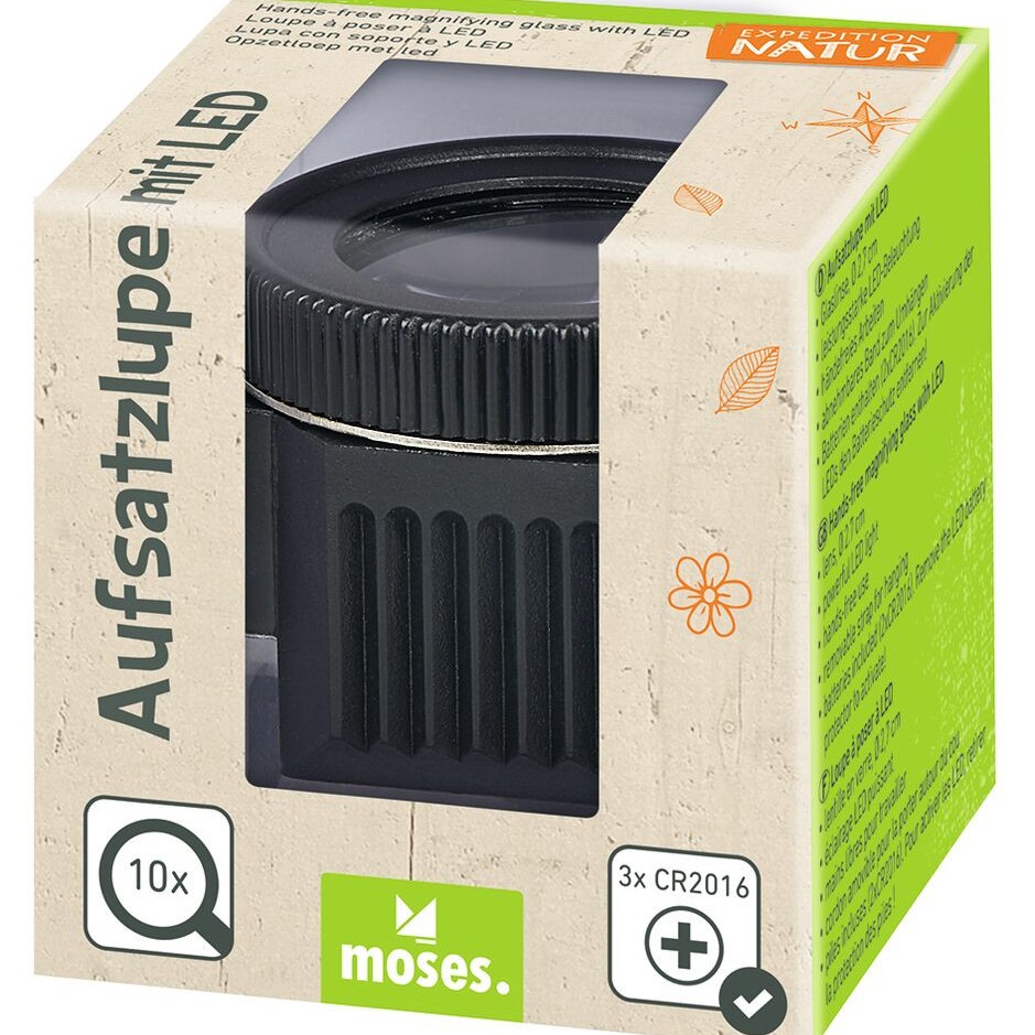 Die Natur in ihren kleinsten Details zu erkunden, war noch nie so leicht! Die Expedition Natur Aufsatzlupe mit LED ermöglicht kleinen Entdeckern händefreies Arbeiten und Staunen durch ein stabiles Kunststoffgestell zum Aufsetzen. Ein robustes Band zum Umhängen macht den Transport der Lupe kinderleicht und verhindert, dass die Lupe herunterfällt oder verloren geht. Dank einer Glaslinse mit 10-facher Vergrößerung werden selbst die kleinsten Insekten und Blattadern sichtbar. Und durch die leistungsstarke LED-Beleuchtung sind Einblicke in die faszinierenden Details der Natur mit dieser Lupe auch bei Nacht und in dunklen Umgebungen möglich. Die Lupe ist jederzeit und überall einsatzbereit und bringt kleinen Forschern die Natur so nah wie möglich.