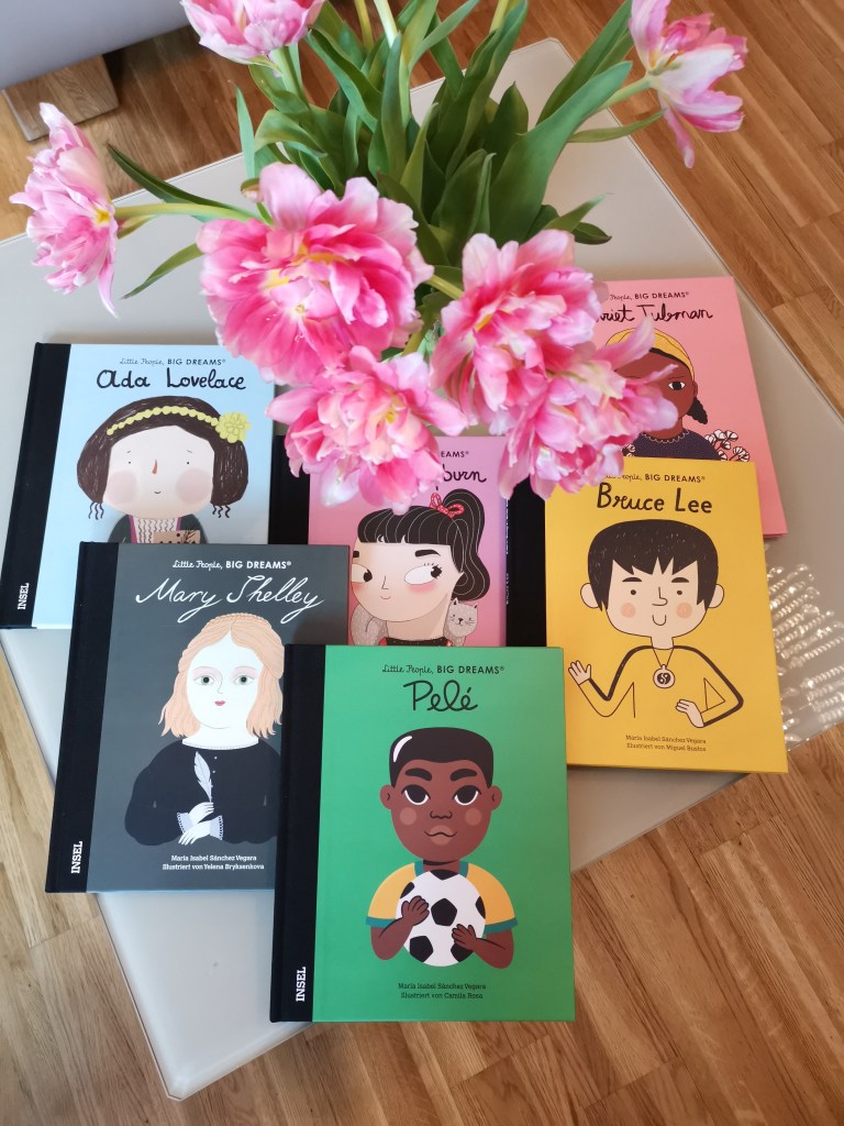 Als diese großartigen Bücher in meiner Post waren, war dieser Tag für mich wie Geburtstag, Weihnachten und Ostern und alle anderen Feiertage auf einmal. Ich hielt diese wunderbaren Neuerscheinungen in Händen. Auf dem Foto seht ihr die 6 Bücher, die ich jetzt mit meinen Kids lesen kann und die den Beginn einer einzigartigen Sammlung bilden. Meine neuen Bücher sind eine großartige Mischung an verschiedensten Persönlichkeiten aus sehr verschiedenen Bereichen.