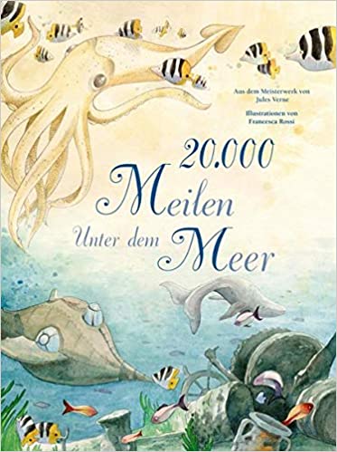 Ich finde den Klassiker von Jules Vernes so großartig und deswegen ist auch heute ein zweites Buch mit der Geschichte von 20.000 Meilen unter dem Meer mit dabei. Diese wundervolle Ausgabe ist für Kinder ab dem Volksschulalter genau richtig, am besten, so ab 9 Jahren, wenn sie schon gut selber lesen können. Hier findet man sehr viel Text und dazu eine Vielzahl an stilvollen, hübschen Illustrationen, die die Geschichte optimal begleiten. Man kann hier das große Abenteuer unter Wasser hautnah erleben und sich auf eine tolle Geschichte einlassen. Ich finde dies ist ein Klassiker der Weltliteratur, den jeder einmal in seinem Leben gelesen haben sollte. Eine wunderschöne Ausgabe!