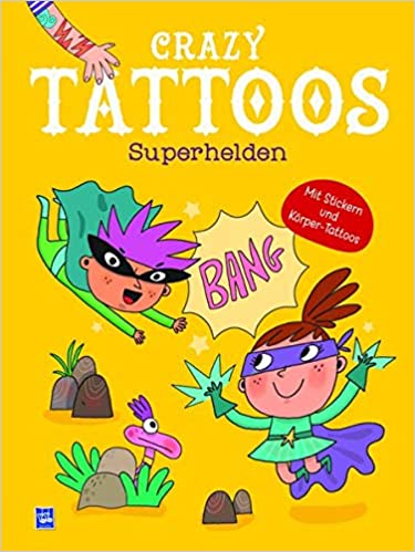 auf jeder Seite, die durch die Sticker zum Aufkleben noch viel mehr Spaß machen. Ein zusätzliches Blatt, in der Mitte des Buches fixiert, enthält die temporären Tattoos für Superhelden. Auf der Rückseite dieses Blattes befinden sich die detaillierten Anweisungen zum Anbringen und Entfernen der Tattoos, sowie alle Angaben zu den Inhaltsstoffen. Die Tattoos entsprechen selbstverständlich den Kosmetik-Richtlinien der EU! Kinder werden diese Bücher lieben!