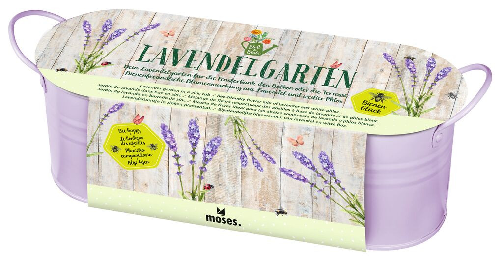 Lavendel zaubert einen Hauch von blühender Provence in die eigenen vier Wände, den Garten oder auf den Balkon. Mit ihrem herrlichen Duft und der intensiven Farbe erinnert die mediterrane Pflanze an die großen Felder in Südfrankreich und bringt Urlaubsfeeling nach Hause. Der Lavendelgarten in der Zinkwanne ist genau das Richtige, wenn Sie eine außergewöhnliche Aufmerksamkeit verschenken möchten. Im Pflanzset ist eine Zinkwanne, Erde und eine Saatmischung aus Lavendel und Mohn enthalten. Die Saatmischung ist perfekt auf die Vorlieben von Bienen abgestimmt und bietet diesen ein reichhaltiges Nahrungsangebot. Wenn der Lavendelgarten blüht macht er sich in der pastellfarbenen Zinkwanne besonders hübsch auf der Fensterbank, dem Balkon oder der Terrasse. Wussten Sie, dass sich mit Lavendelblüten auch sommerliche Salate aromatisch verzieren lassen? Die dekorativen Farbtupfer sind vielfältig einsetzbar und zaubern garantiert ein Lächeln aufs Gesicht.