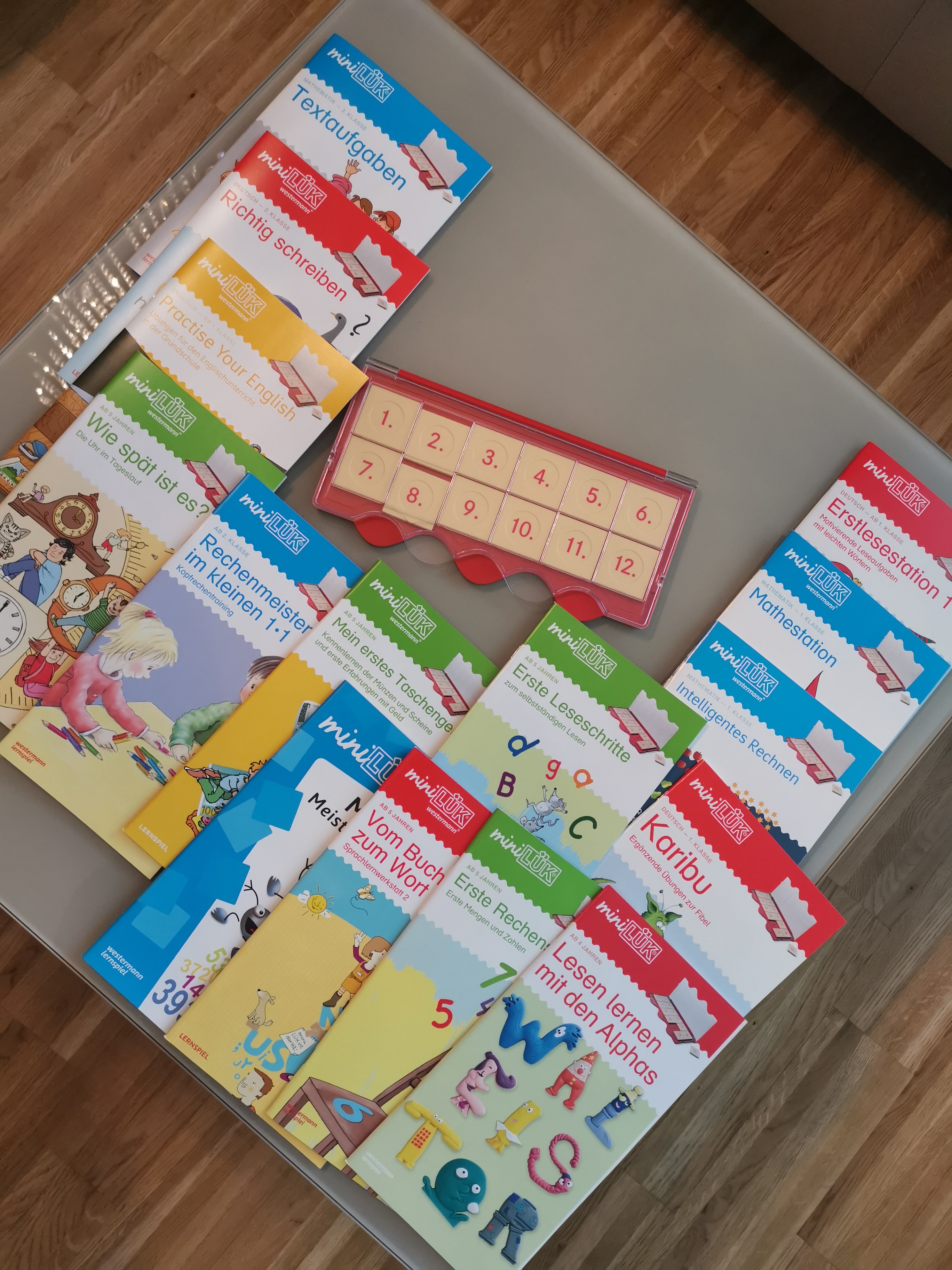 Schon vor vielen Jahren haben wir ein Bambini LÜK geschenkt bekommen und es fleißig und voller Eifer geübt und gemacht. Jetzt sind die Übungen schon zu leicht und es musste einfach ein Mini LÜK her mit verschiedensten Übungsheften für unterschiedliche Altersgruppen – bei uns Vorschule und Mitte Volksschule. Ich bin vom LÜK System total begeistert, weil die Kinder mit nur wenig Übung alles selber machen und entdecken können und es sofort eine Lösung gibt und man sieht, ob man die Übungen richtig gemacht hat, oder nicht. Das Mini LÜK System funktioniert ein bisschen anders, als das Bambini LÜK und ist mit Zahlen von 1 bis 12 ausgestattet. Ich habe euch auf dem Bild eine tolle und sehr vielseitige Mischung fotographiert. Hier sieht man sehr gut, wie viele verschiedene Themen und Bereiche es hier gibt.