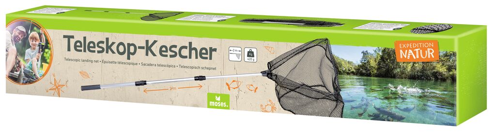 Ab auf Entdeckungstour! Was schwimmt denn da? Und was fliegt da umher? Der Expedition Natur Teleskop-Kescher erleichtert Kindern das spielerische Entdecken von Teichen, Bächen und Wald und Wiese. Der Teleskop-Kescher ist ideal für Ausflüge ins Grüne, denn er ist klappbar und lässt sich somit leicht im Rucksack verstauen. Das robuste, gummierte Netz ist zudem pflegeleicht, schnelltrocknend und verhindert Geruchsbildung und Bakterienwachstum. Der Kescher hat einen rutschfesten Handgriff und eine stabile Teleskopstange aus Aluminium, die sich auf drei Längen verstellen lässt und als verlängerter Arm fungiert. So lassen sich allerlei Insekten, Treibgut und Pflanzen aus bis zu 1,5 Metern Abstand einfangen. Sollte sich bei der Expedition in einem Gewässer ein Fisch im Netz verirren, schützt das gummierte Netz die Fischschuppen. Lebewesen sollten wieder in die Natur entlassen werden.
