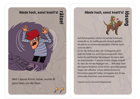 Ist ab 2 Spieler geeignet und durch Fragen, Raten und Tüfteln versucht man die Rätsel zu lösen. Manche Rätsel gehen ganz schnell, andere brauchen etwas Zeit. Die Geschichten reichen von Rategeschichten, kriminelle Papageien, Einbrecher und verspeiste Tatwaffen!