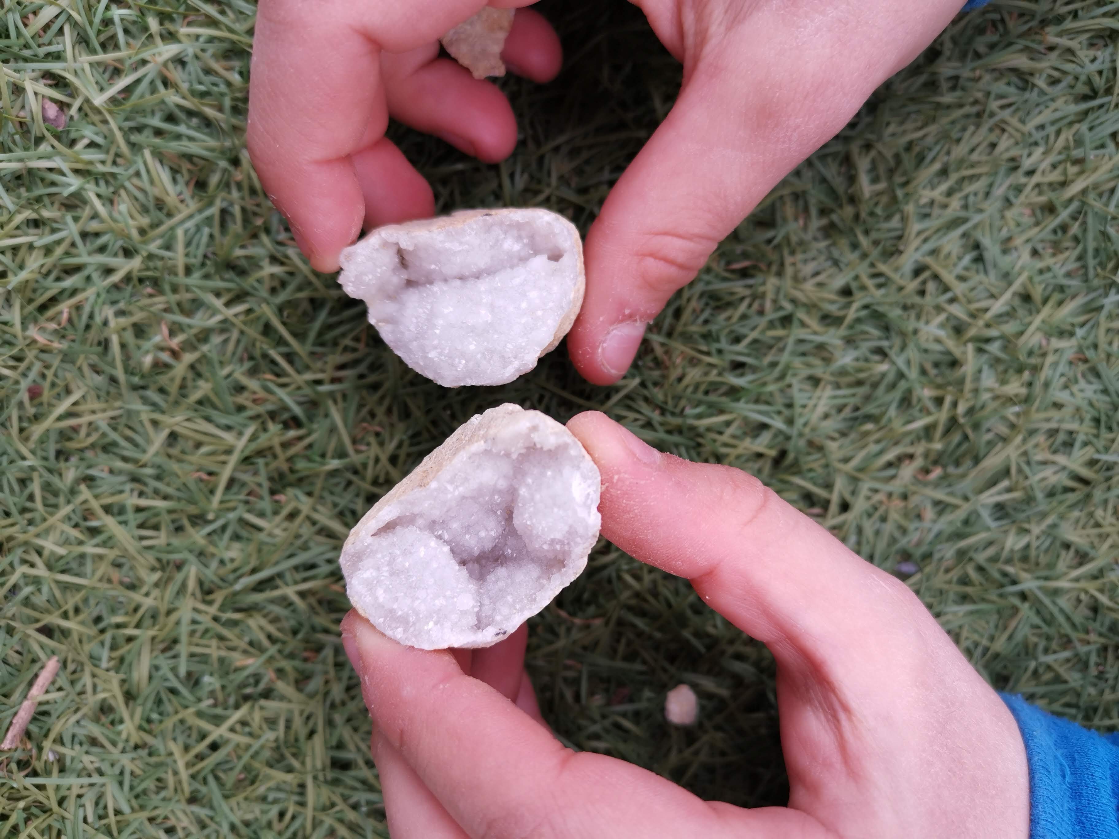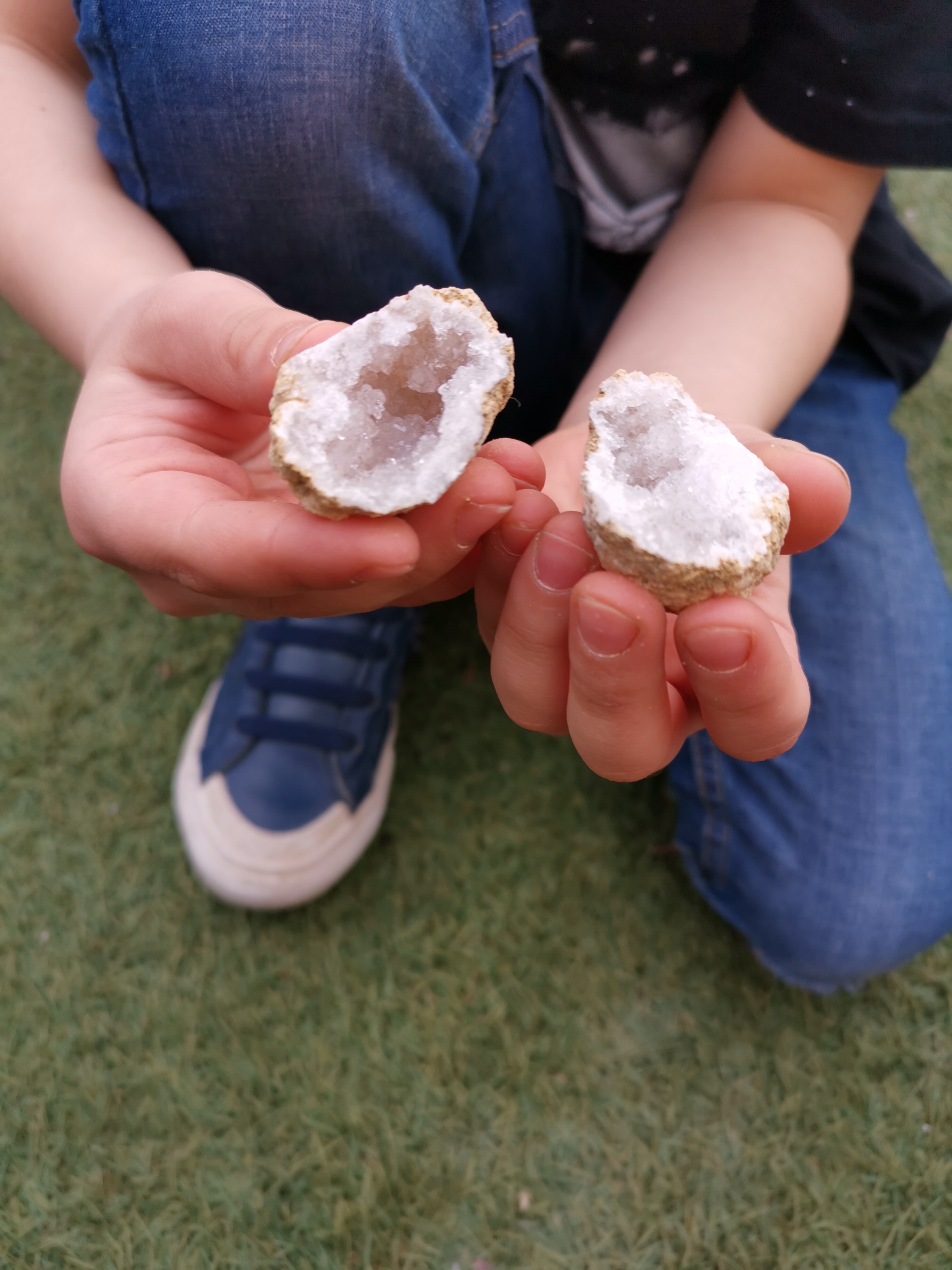 Die Freude ist mega groß, wenn die erste Geode offen ist und man die Kristalle darin gemeinsam entdecken kann und recherchiert, welche sich denn im Inneren befinden.