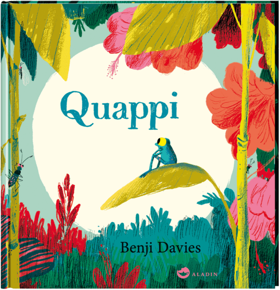 Doch nun wurde auch Quappi größer und eines Tages verschwand auch sie aus dem Wasser, weil sie springen konnte. Sie landete auf einem Stein und blickte mit ihren großen Augen in den Himmel und fühlte sich sehr wohl. Plötzlich singt sie laut „ich bin keine Kaulquappe mehr“. Quappi ist zum Frosch geworden. Vom Bauch bis zu den Zehenspitzen.