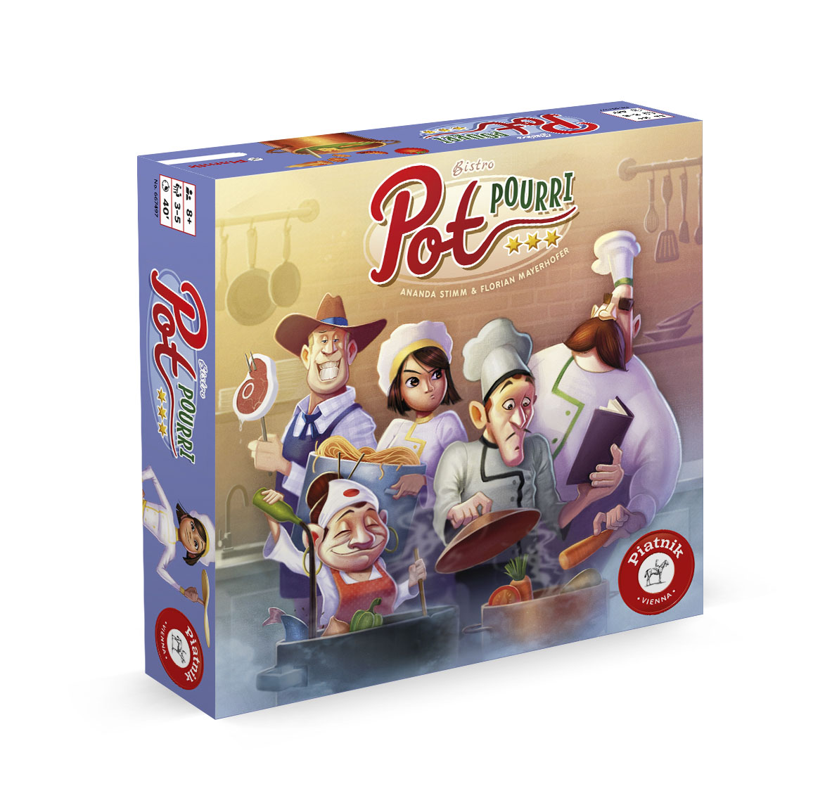 Heiße Küchenschlacht im Bistro „Pot Pourri“: Wer stellt seine Kochkünste am besten unter Beweis und sichert sich die meisten Gourmetsterne? Drei bis fünf Personen ab acht Jahren wetteifern bei „Pot Pourri“ mit ihren kulinarischen Fähigkeiten und versuchen, auch im heißen Dampf der Küche einen kühlen Kopf zu bewahren. Denn es gibt nur drei Kochtöpfe für alle – und der nervige Topfdeckel ist auch oft im Weg… Erschienen ist das vergnügliche Kochspiel von Ananda Stimm und Florian Mayerhofer im Wiener Spieleverlag Piatnik.