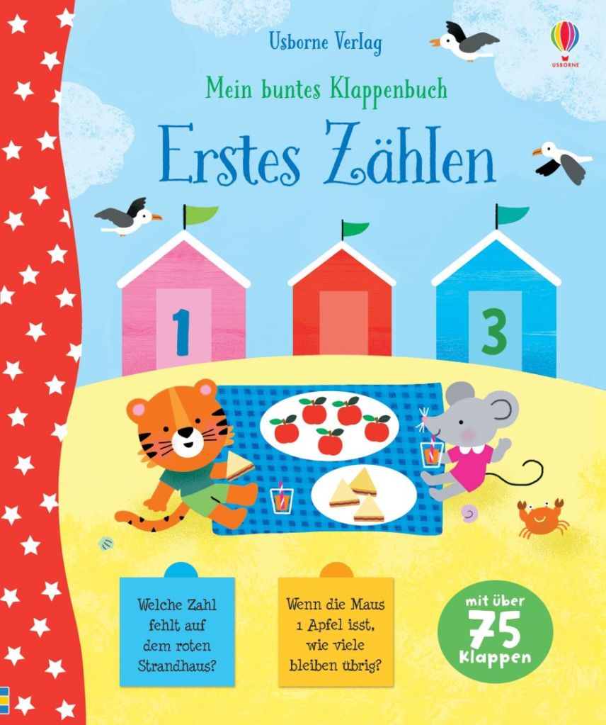 Dieses großartige Vor- und Schulbuch enthält ca. 75 Klappen, die man alle öffnen kann. Nach den verschiedenen Fragen wie z.B. wie viele Mäuse sitzen in der Gondel Nr. 6, darf man die Klappe öffnen und zählt, wie viele Mäuse im Inneren sitzen. Das geht bis zur Gondel Nr. 10.