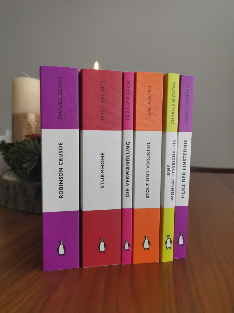 Alle Bücher, die ich euch heute zeige, gehören für mich definitiv auf eine Leseliste der Bücher, die man im Leben gelesen haben sollte, meint ihr nicht auch? Eine Weihnachtsgeschichte von Charles Dickens ist mit Sicherheit einer der großen Weihnachtsklassiker, die man kennen sollte. Herz der Finsternis von Joseph Conrad ist ein Buch, dass ich vor vielen Jahren gelesen habe und dass mich richtig begeistert hat, die Verwandlung von Kafka, so ekelhaft sie inhaltlich sicherlich für viele ist beschrieben ist, ist ein Klassiker, den man in der Schule einfach gelesen haben muss, Jane Austen – hier mit dem Buch Stolz und Vorurteil ist ein wunderbares Eintauchen ins alte England, Sturmhöhe von Emily Bronte ist der einzige ihrer Werke, das noch zu ihren Lebzeiten veröffentlich wurde, und Robinson Crusoe ist eines der Bücher, die ich bei meinem Papa im Regal als Kind entdeckt und verschlungen habe – ein altes, kaputtes Buch, auf dass er sehr stolz war und ich, dass ich es lesen durfte. Zu jedem Buch gibt es eine persönliche Geschichte 🙂 Was ist eure?