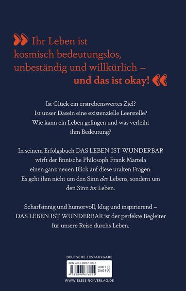 Ich muss gestehen, die Optik des Buches hat mich im ersten Augenblick abgeschreckt, dafür ist der Inhalt umso fesselnder. Frank Martela hat es wirklich drauf. Er kombiniert Wissenschaft mit Lebensphilosophie, garniert das Ganze mit einer Prise Humor und zum Abschluss serviert er Weisheiten von den großen Denkern unserer Zeit. Also nichts wie ran an die Frage aller Fragen!