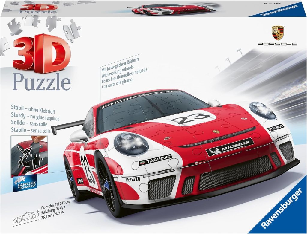- Mit diesem 3D Puzzle von Ravensburger erleben Kinder und Erwachsene ab 8 Jahren ein einzigartiges, dreidimensionales Puzzleerlebnis und können mit nummerierten Kunststoffteilen den original Porsche GT3 Cup Salzburg Design im Maßstab 1:18 puzzeln