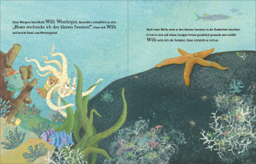 Auf einmal hört Willi ein „Buah“ durch das Meer donnern, ein riesiger Wal taucht plötzlich auf und er bekommt große Angst. Er schwimmt um sein Leben, aber da hört er den kleinen Seestern um Hilfe rufen!