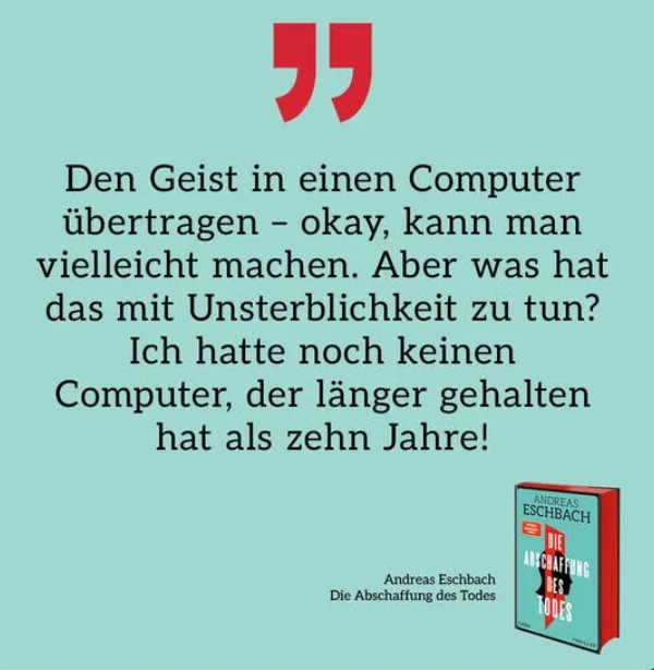 Dieser Autor gehört zu meinen „Lieblingen“. Er ist ein Garant für fantastische Geschichten, die immer auch einen Bezug zu Realität haben. Gerade wo ich in dieses Buch vertieft war, starteten die neueren KI-Modelle und es voilà unseren Bezug zu dieser Geschichte da. Irgendwie unheimlich, als wüsste Hr. Eschbach mehr als wir ;-).