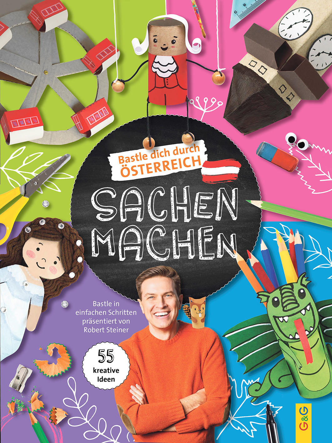 Erstmals präsentieren Robert Steiner und Melanie Steiner 55 Bastelanleitungen der beliebten Serie in der KidsKrone als Buch! Jede Anleitung wird mit farbigen Fotos in 3-4 Schritten erklärt. Die witzigsten und schönsten Kunstwerke zum Selbermachen führen durchs österreichische Jahr, immer wieder ergänzt mit spannendem Hintergrundwissen von Robert Steiner. Für jedes Bundesland ist etwas dabei – von den Sängerknaben über den Lindwurm bis zum Tirolerhut gibt es eine Menge kreativer, lustiger Ideen zu entdecken!