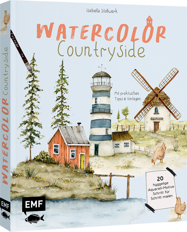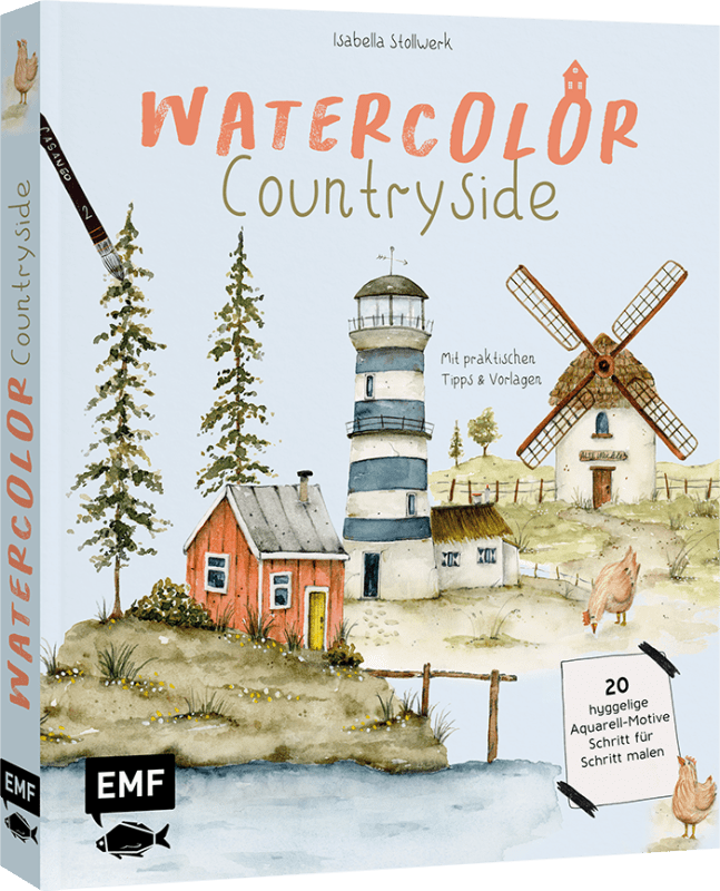 Das Hardcover ist mit gemütlich aussehenden Motiven bestückt. Es geht in diesem Buch um die Reisen auf das Land. Alte Scheunen, Wiesen, Leuchtturm, Gartenhaus, Kräutertisch und vieles mehr. Insgesamt werden 20 Aquarell-Motive vorgestellt.